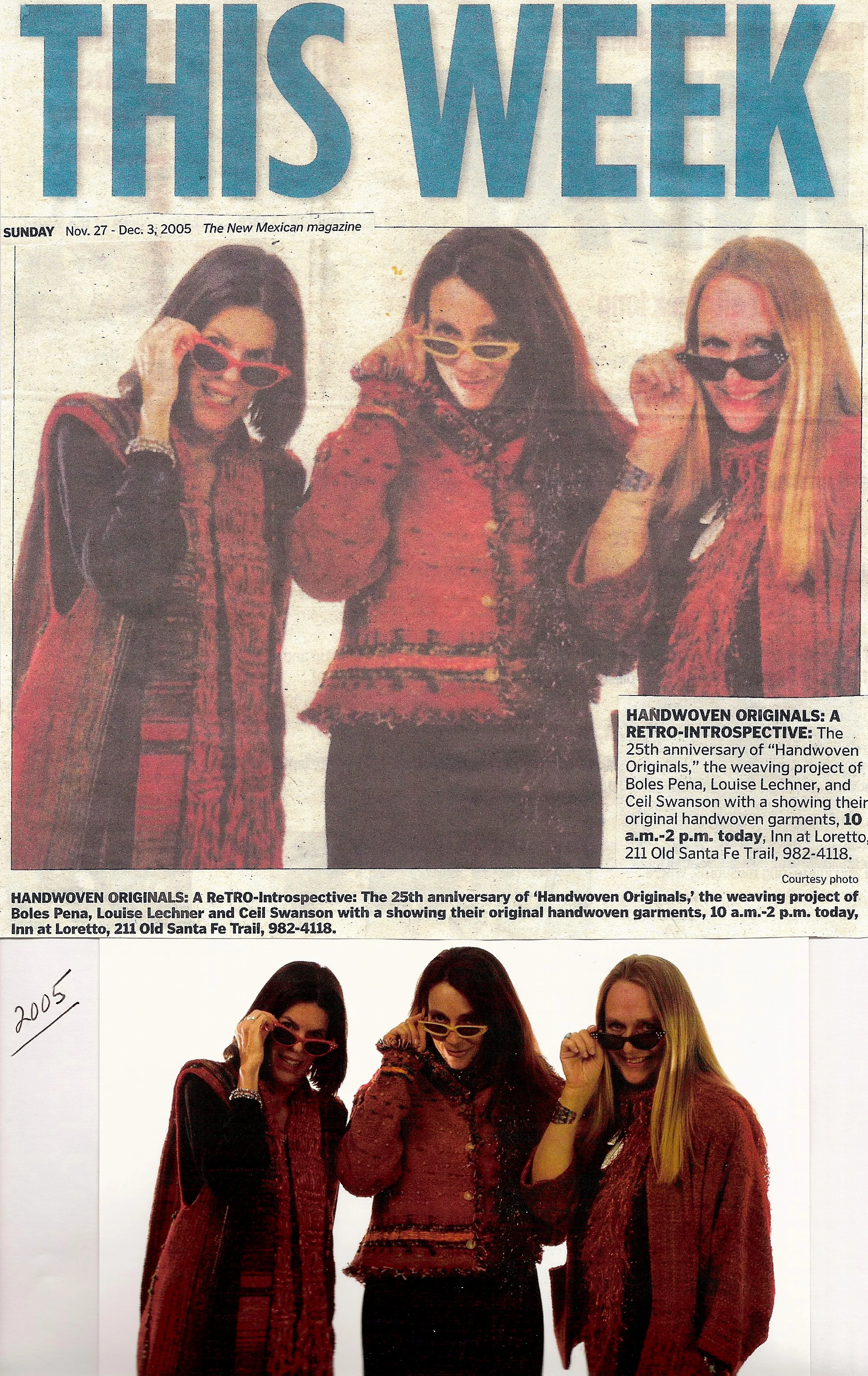 Handwoven Originals got its modest start in 1976 when J.B. (J. Boles Peña) opened the doors to her tiny weaving studio on Bull Ring Alley in Santa Fe. Louise Lechner soon joined her and they would work at their looms while tending the shop. In the summers, they staged fashion shows at the nearby Pink Adobe restaurant. Their business continued to grow and in August 1980 they moved to their current space in the Inn at Loretto.